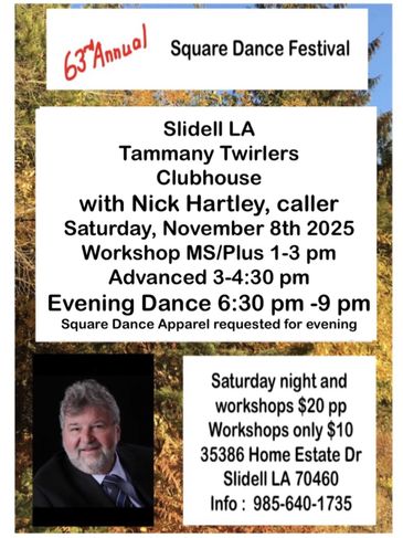 35386 Home Estate Drive Tammany Twirlers dance on Tuesday night: 7:00- 9:00 Square Dance Class/Workshop and Saturday nights 6:00 Pre-rounds, dancing from 6:30-8:30 2+2. For information, text or call Rod and Kathy Busby, Presidents (985) 640-1735 or Click below for more info.