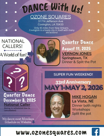 Ozone Squares Dance on Monday nights from 7:30-9:30 (Except Quarter dances)