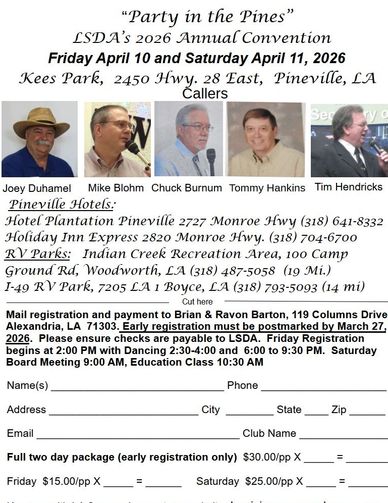 NEW "LOUISIANA Lagniappe". Fridays: April 3, May 29. Basic - PLUS 7:00-9:00 PM Tim Tyl, Caller Donation Dance SEE MONTHLY SPECIAL DANCE SCHEDULE BELOW. BEGINNERS SQUARE DANCE LESSONS TWICE PER YEAR, CALL FOR DETAILS